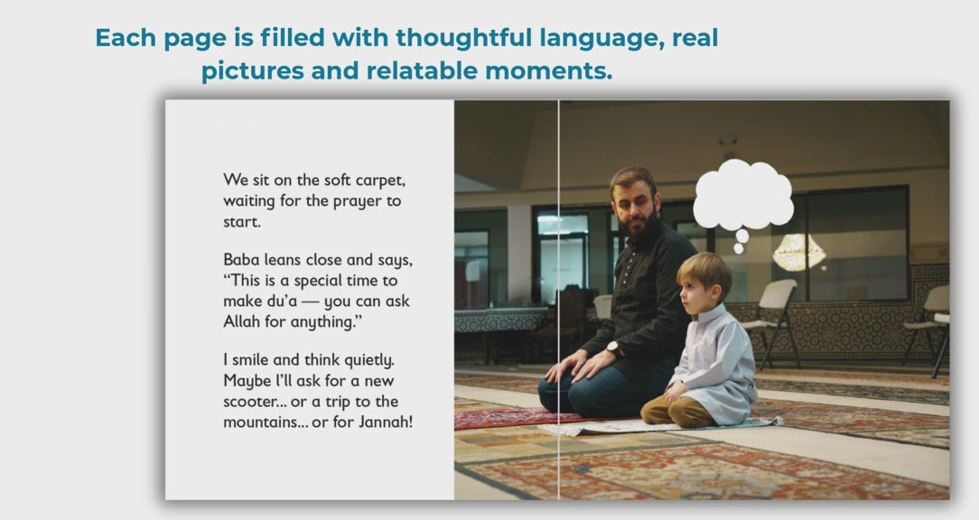 Omar Goes for Prayer is an engaging, Montessori-aligned board book that follows little Omar as he joins his Baba for daily salah at the mosque. Through real-life photography and warm, simple storytelling, the book helps young children become familiar with prayer as a natural, meaningful part of everyday life.